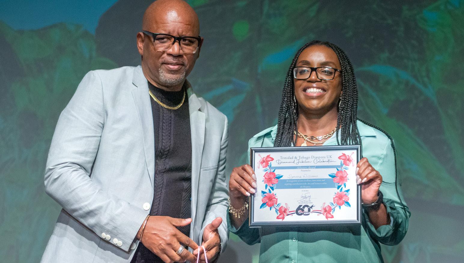 Ancil Barclay presented a Young Achiever Award to Symone Williams (“a Trini who happened to be born in London”) whose mas design and leadership of Genesis mas band are as respected by today’s London’s carnival community as her father, the late Vernon Fellows Williams, was in the past. Symone is now going into schools to pass on her skills. She ended her presentation by saying that an anniver sary book will be published by the end of the year.