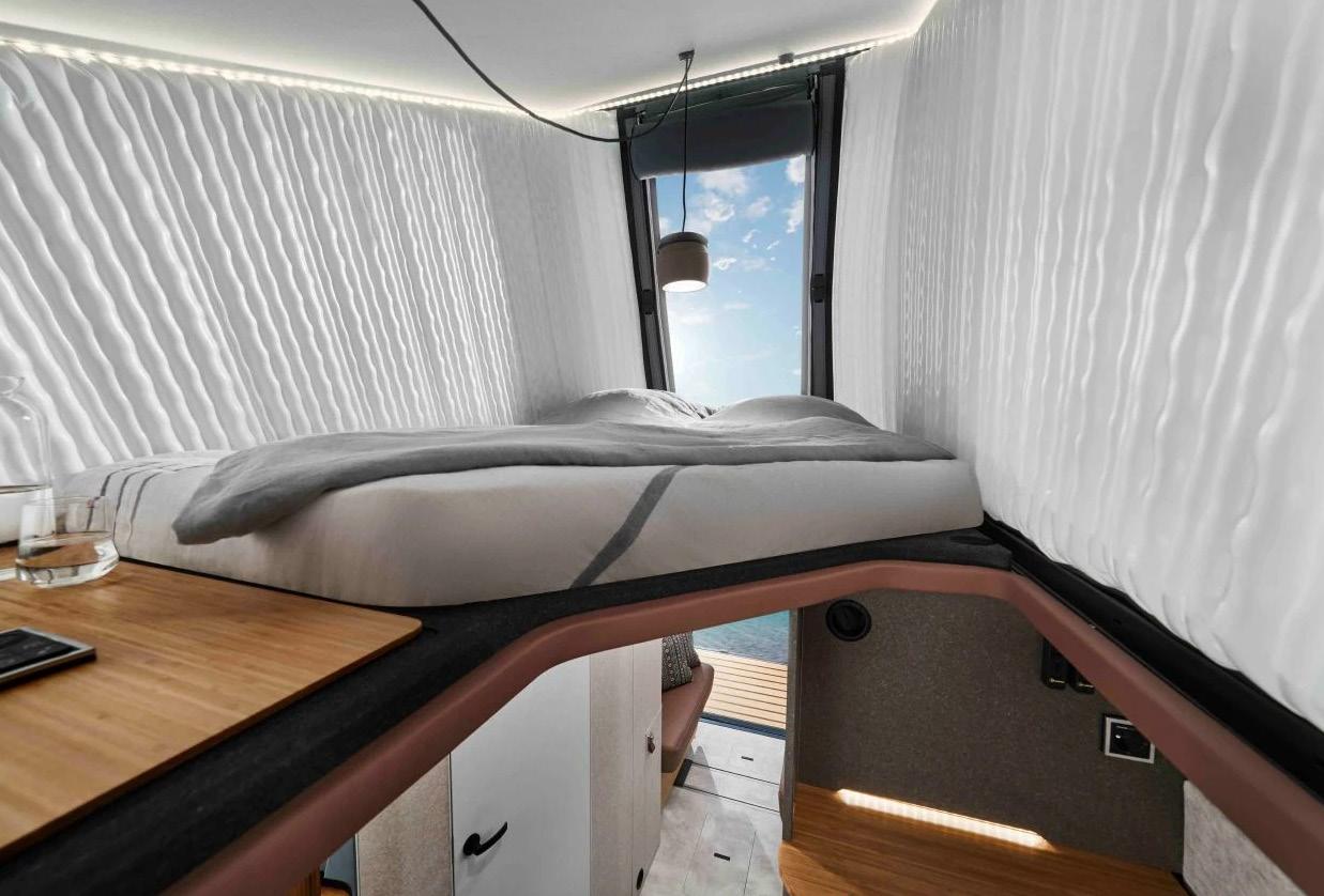 Cuando la empresa alemana habla de su nueva casa rodante, lo que realmente expresa es que es un medio de transporte colmado de facilidades para cubrir todas las necesidades. Un verdadero de partamento sobre cuatro ruedas. El vehículo cuenta con un techo elevable (se despliega en tres minutos) que posee un aislamiento inflable con un sistema térmico. Esto permite que se pueda dormir sin problemas en todos los climas del año. Para acceder al piso superior cuenta con unas escaleras que a su vez funcionan como receptáculos de almacenamiento.