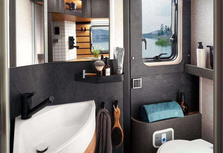 Por último, a nivel de tecnología, se incluyen un altavoz portátil, un proyector con pantalla con sujeción para la pared, luces de lec tura que se pueden instalar en diversos lugares y el sistema Hymer Connect para el vehículo, el cual permite un pleno control de los diversos componentes a través de la pantalla táctil integrada de 7,0 pulgadas o de un smartphone.