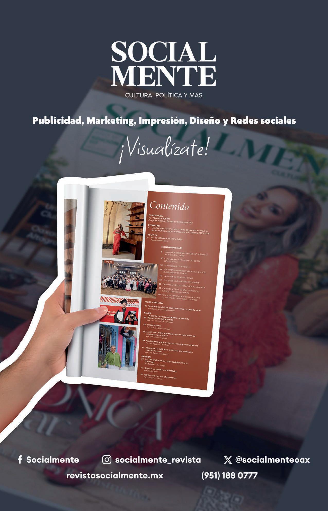 Socialmente es una publicación mensual de circulación estatal. AÑO XI, NÚMERO 118, Septiembre 2025. Editor responsable: Hernán Sánchez Iniestra. Número de Reserva ante el Instituto Nacional del Derecho de Autor: en trámite. Certificado de Licitud de título y Contenido: en trámite: Domicilio: Sauces #333, Col. Reforma, Oaxaca de Juárez, C.P. 68050. El contenido de los artículos y de los anuncios es responsabilidad de los autores y de las empresas. Queda prohibida la reproducción parcial o total del contenido, imágenes y fotografía sin previa autorización por escrito de los editores. Impresa en: Talleres de Docuprint Digital Center SA. De CV. Insurgentes No. 121, Colonia Lomas del Santo, San Agustín de las Juntas, C.P. 71238, Oaxaca.