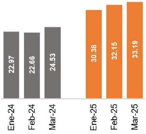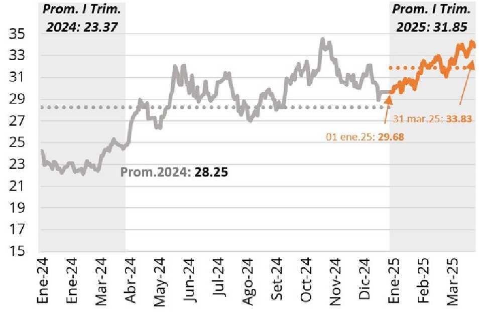 El precio promedio del I Trimestre 2025 (US$ 31.85 por onza troy) fue: