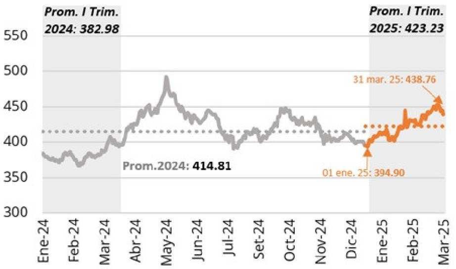10.5% por encima del precio promedio del mismo trimestre en el 2024 (I Trim. 2024: cUS$ 382.98 por libra).