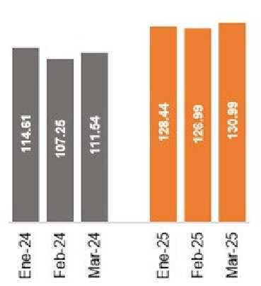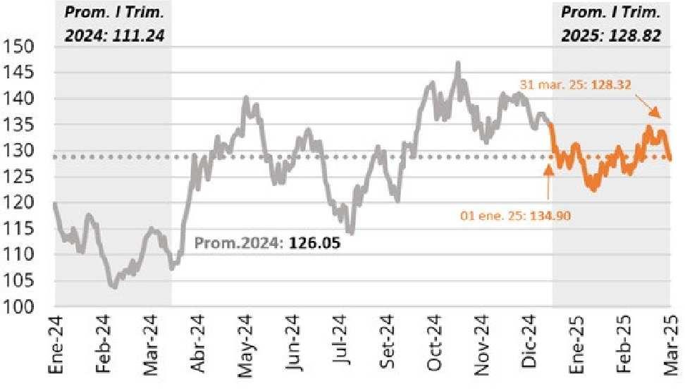 El precio promedio del I Trimestre 2025 (cUS$ 128.82 por libra) fue: