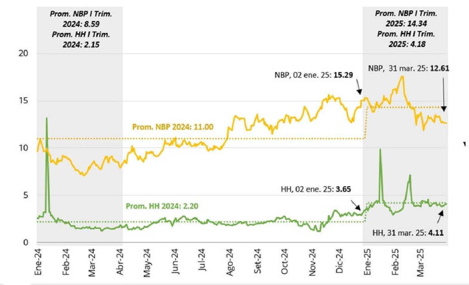 En el primer trimestre de 2025, los precios del gas natural en los mercados de National Balancing Point (NBP) y Henry Hub (HH) siguieron trayectorias distintas, aunque ambos estuvieron influenciados por factores estacionales y geopolíticos. En enero, ambos reaccionaron a un invierno más fuerte, lo que elevó la demanda de calefacción y redujo los niveles de inventarios. En Europa, el NBP registró presiones adicionales debido a la interrupción del suministro de gas ruso a través de Ucrania, lo que intensificó la incertidumbre energética. En paralelo, en EE.UU., el mercado HH se vio impactado por una ola de frío que incrementó marcadamente el consumo de gas y provocó una gran reducción de inventarios, lo que impulsó un primer pico de precios a mediados de enero. En febrero, hacia fin de mes, el NBP cayó de forma más notoria hacia el cierre, como resultado de temperaturas más templadas y mayor disponibilidad de gas, mientras que, el Henry Hub registró un segundo repunte a raíz de una nueva ola de frío que reactivó la demanda de calefacción, en un contexto de inventarios ajustados y alta demanda de exportaciones de gas natural licuado. Finalmente, en marzo, ambos mercados mostraron una moderación. En Europa, el retroceso fue más marcado, favorecido por el aumento de la generación eólica, la menor demanda residencial y una mayor oferta desde terminales como Easington en el Reino Unido. En EE.UU., la caída en HH respondió al ascenso estacional de las temperaturas, que redujo la demanda de calefacción, junto con una mayor estabilidad en el suministro, tras la normalización de los flujos en los gasoductos.