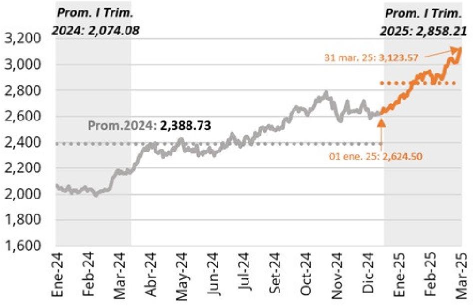 En el primer trimestre de 2025, los precios del oro registraron una tendencia al alza, alcanzando niveles elevados. En enero, el incremento estuvo impulsado por una mayor demanda de activos refugio, la depreciación del dólar y la caída en los rendimientos de los bonos del Tesoro de Estados Unidos. En febrero, la cotización continuó al alza, favorecida por el debilitamiento del dólar, la persistente reducción de rendimientos en EE.UU. y cierta moderación en los riesgos geopolíticos. Aunque se observó una leve caída a mediados de mes, el precio continuó la tendencia al alza. En marzo, el oro repuntó ante el resurgimiento de tensiones geopolíticas en Medio Oriente y la incertidumbre en torno a la política comercial estadounidense. El trimestre cerró con una fuerte alza, consolidando al oro como uno de los activos refugio más demandados en un contexto de volatilidad global y expectativas financieras inciertas.