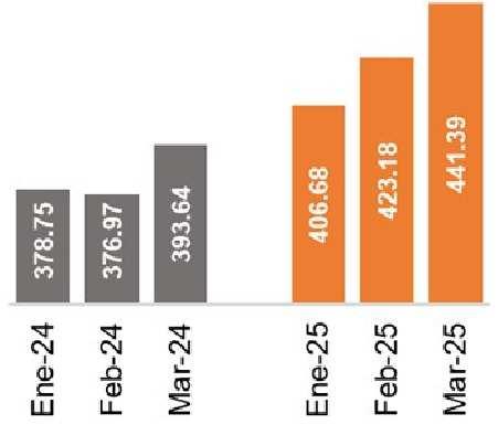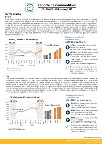 Entre enero y marzo de 2025, el precio del cobre mostró una tendencia mayormente alcista, impulsada por la caída de inventarios, señales de recuperación de la demanda en China y restricciones en la oferta de países productores. En enero, la cotización subió de forma gradual, apoyada por una menor disponibilidad en los mercados y un repunte en las importaciones chinas. En febrero, el impulso continuó ante interrupciones en la producción minera de Chile, asociadas a labores de mantenimiento y menor ley del mineral, así como por nuevas medidas de estímulo económico en China, especialmente dirigidas al sector inmobiliario. En marzo, el cobre continuó con la tendencia ascendente debido a expectativas de mayor consumo en sectores como infraestructura y tecnología, además de compras especulativas ante posibles barreras comerciales. No obstante, hacia el cierre del mes, los temores sobre el crecimiento global y las tensiones comerciales generaron una leve corrección en el mercado.