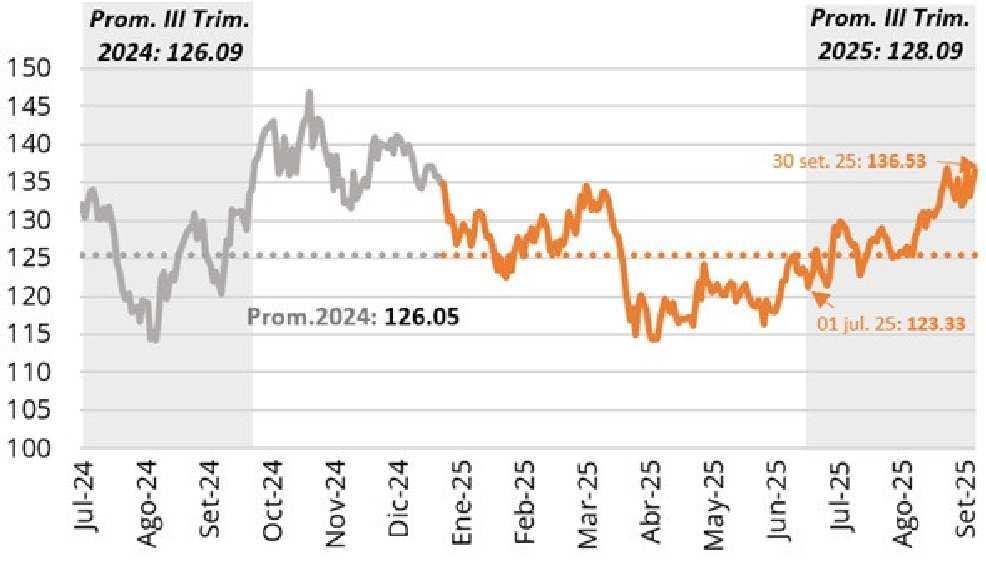 1.6% mayor que el precio promedio del mismo trimestre del 2024 (III Trim. 2024: cUS$ 126.09 por libra).