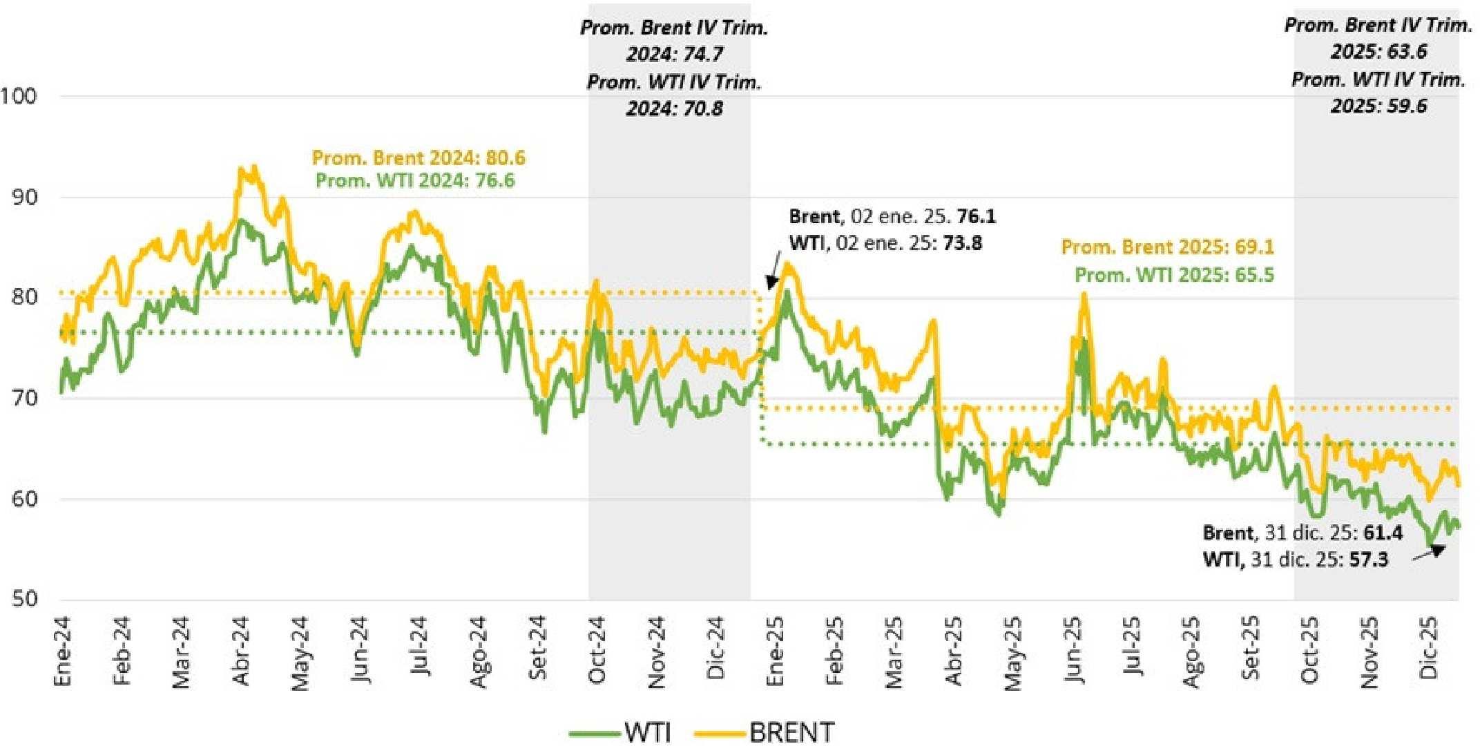 El precio WTI promedio del IV Trimestre 2025 (US$ 59.6 por barril) fue: