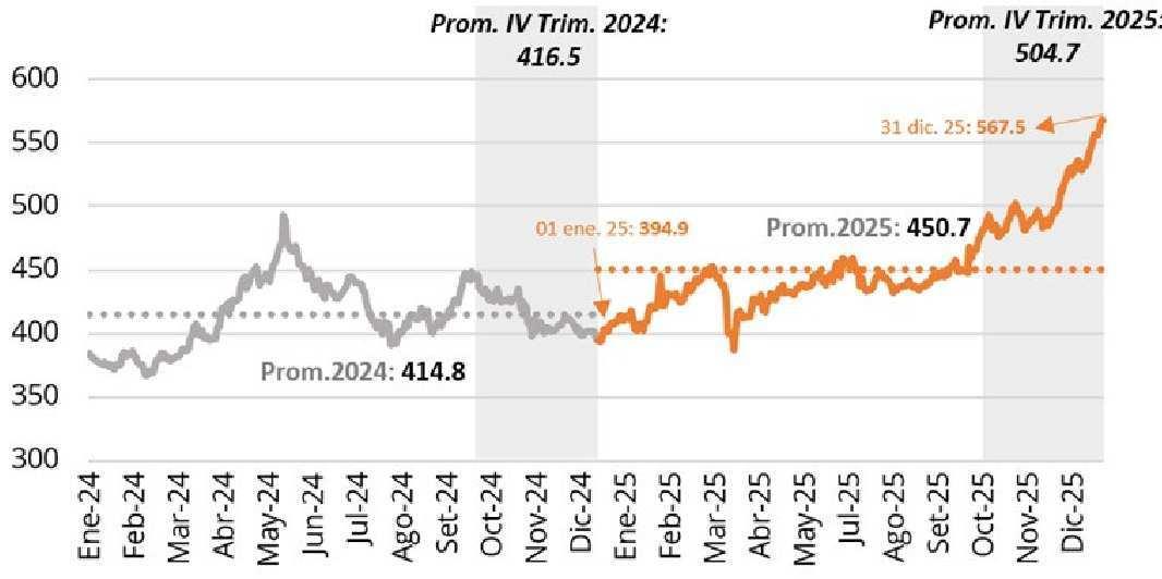 12.0% mayor al precio promedio anual en el 2025 (prom. 2025: cUS$ 450.7 por libra).