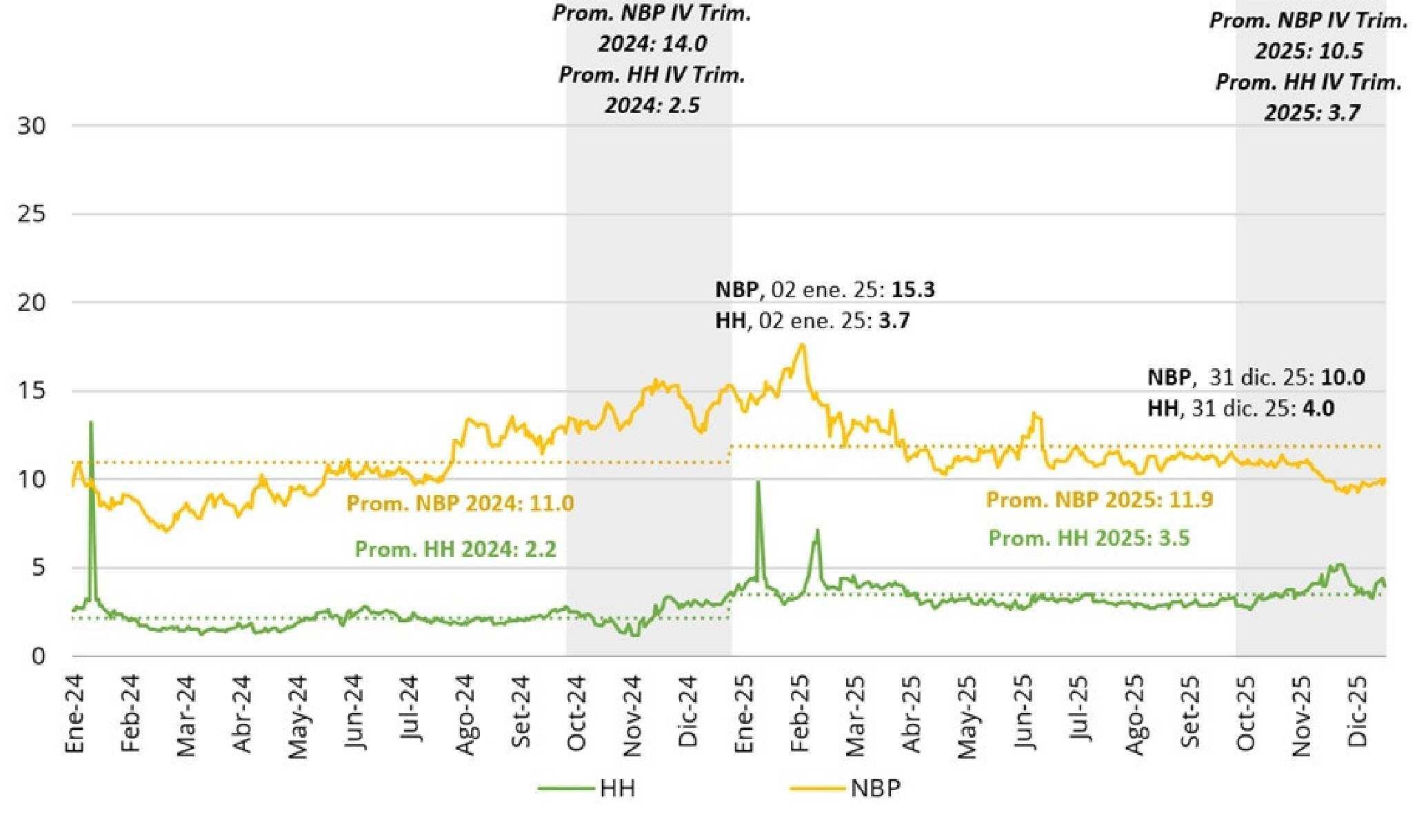 En el mercado HH, los precios repuntaron a inicios de año por un invierno más frío y luego se mantuvieron en un alza moderada impulsada por el incremento de las exportaciones de GNL.