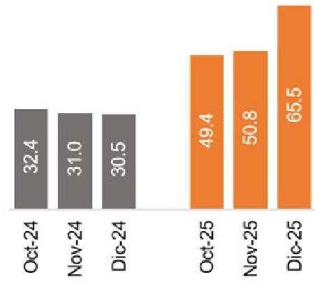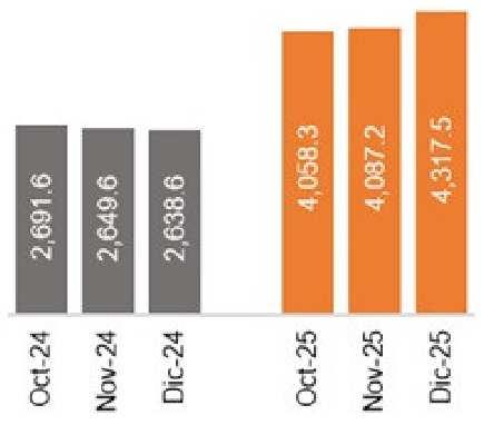 Entre octure y diciembre de 2025, la plata mantuvo una tendencia marcadamente alcista. En octubre hubo una subida fuerte en la primera mitad del mes por la oferta limitada en Londres y una mayor demanda desde India, alcanzando niveles altos. Para finales de ese mes retrocedió por correcciones del mercado, aunque de manera moderada debido a la sostenida demanda industrial pese a las preocupaciones por una desaceleración económica generalizada. En noviembre, el metal subió rapidamente debido a la incertidumbre y fin del shotdown en EE.UU., a las expectativas de que la Reserva Federal redujera las tasas, una oferta aún escasa y la noticia de la inclusión del metal en la lista de minerales críticos de Estados Unidos. En diciembre, el precio del metal siguió subiendo con mayor intensidad, impulsada por tensiones geopolíticas, mayores compras de activos refugio y el anuncio de China de restringir sus exportaciones de plata a partir de 2026, lo que aumentó la demanda y llevó al precio a nuevos máximos hacia el cierre del trimestre.