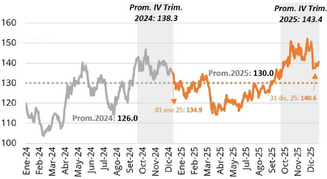 10.3% superior al precio promedio anual en el 2025 (prom. 2025: cUS$ 130.0 por libra).
