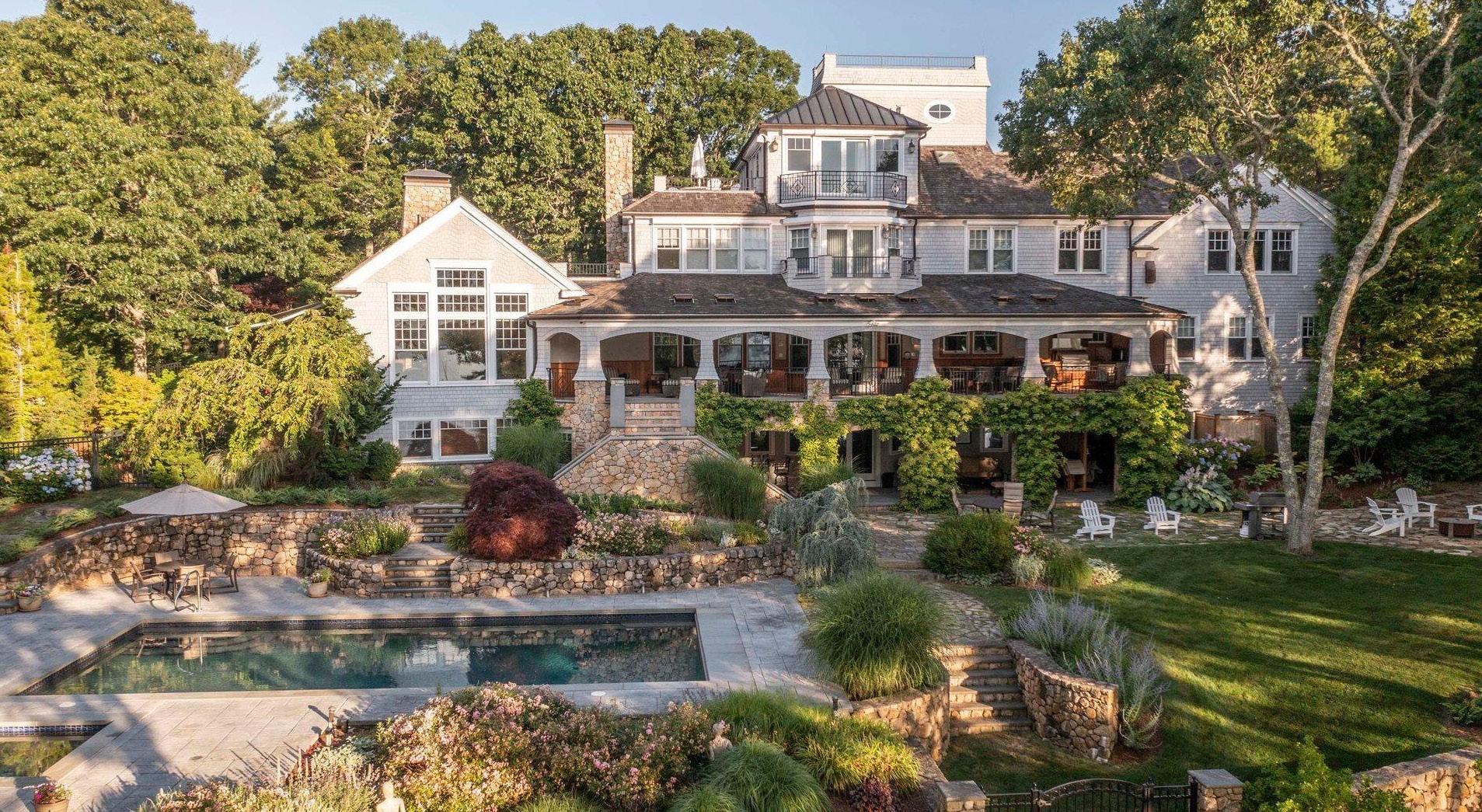 Exquisite waterfront estate on Cotuit Bay featuring a seven-bedroom residence with a swimming pool, deep-water dock, and sandy beach.