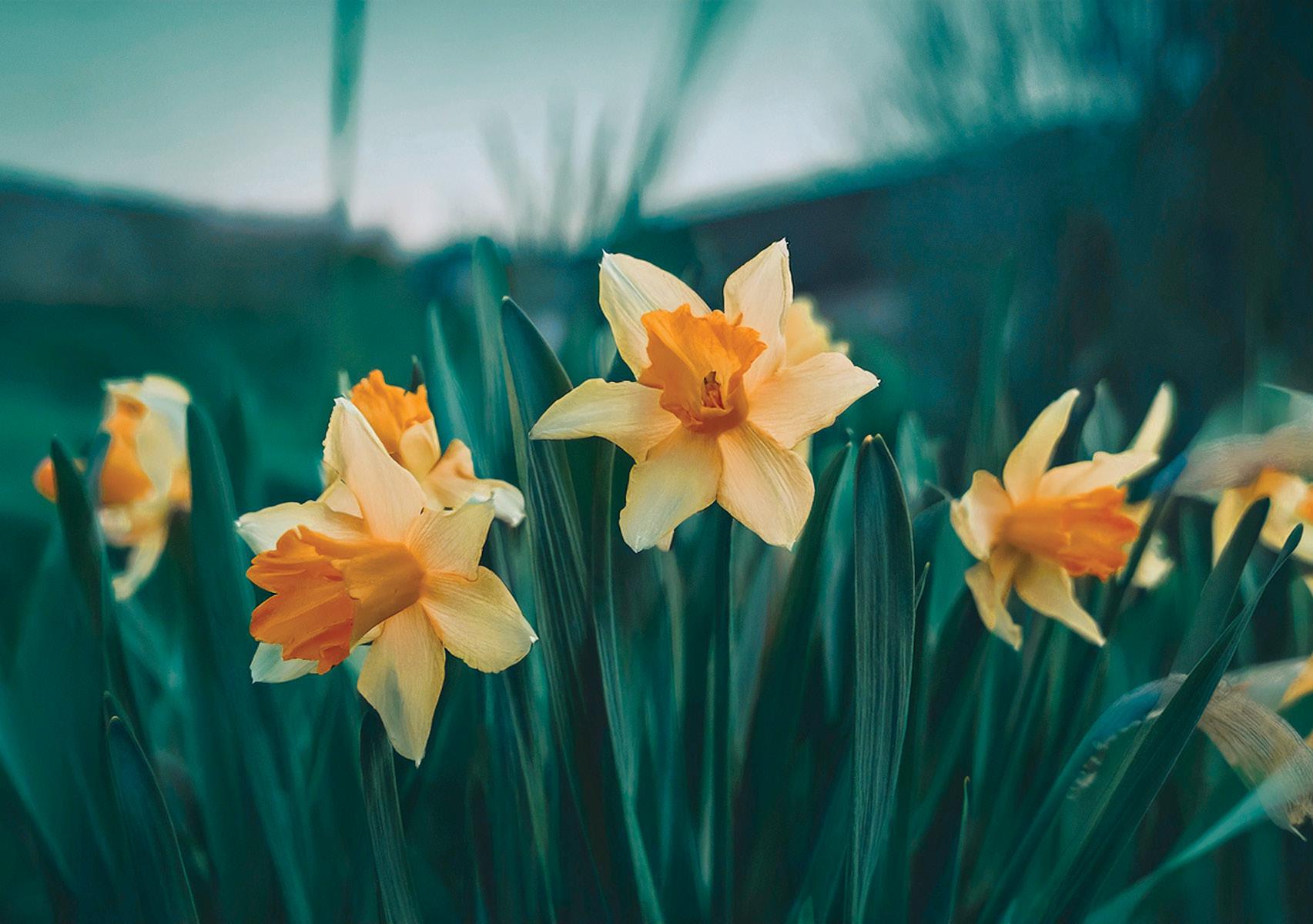Colors of spring. Blooming daffodils, green lawns, and trees showing red buds are hints that summer is close by.