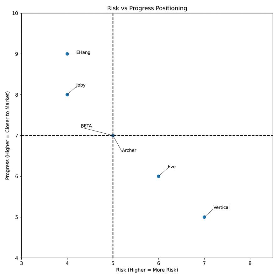 EHang currently represents the most advanced regulatory position. If its commercial operations proceed as expected, it will be the first to demonstrate real passenger service. Joby appears to be the closest among Western companies to achieving certification and initial deployment. Archer has built a strong narrative around partnerships, policy alignment, and its Olympic role. And BETA now stands out as a company with a credible near-term operational pathway through its Surf Air partnership. Eve, while not making headlines, offers a more traditional aerospace-backed approach, while Vertical Aerospace remains a participant with more limited financial flexibility.