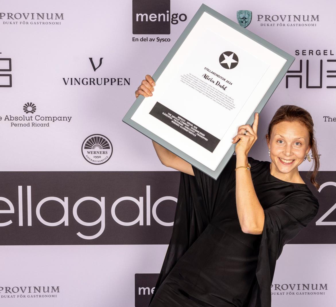 Alicia Dahl, ansvarig för K-märkts bageri och konditori i Stockholm poserar med sin utmärkelse ”Stellakonditor 2024” under prisutdelningen på Stellagalan.
