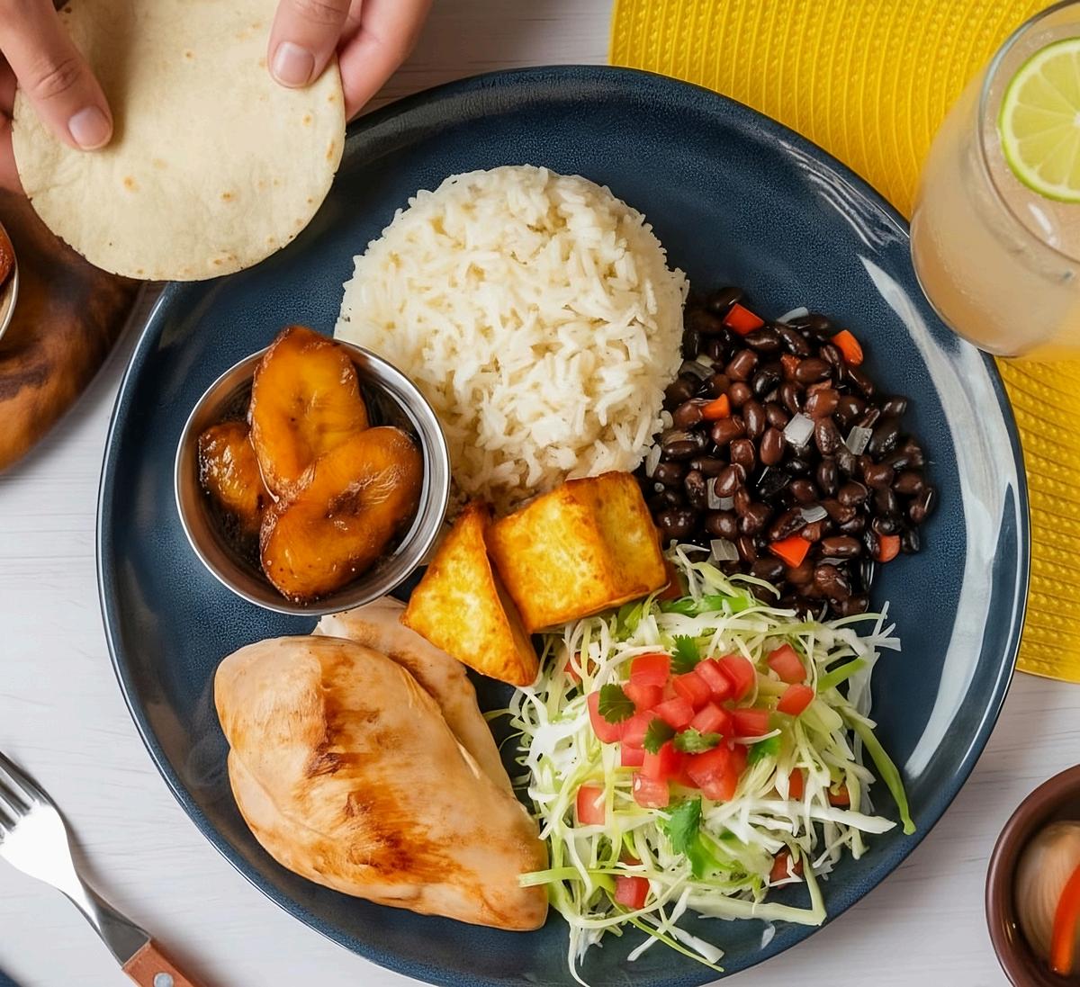 Bandeja paisa: fríjoles sin grasa, carne magra, arroz integral, huevo cocido y sin embutidos.