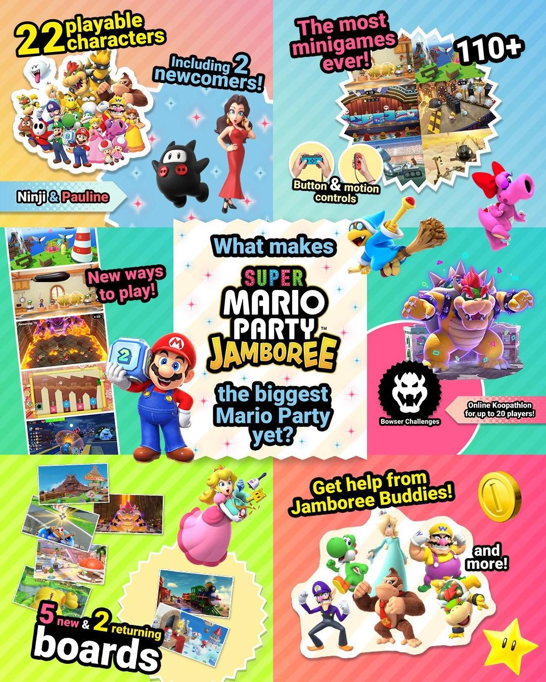 Super Mario Party Jamboree es un videojuego de fiestas publicado por Nintendo para Nintendo Switch. Se trata de la decimotercera entrega para consolas domésticas de la serie Mario Party, la tercera para Nintendo Switch y el sucesor de Super Mario Party.