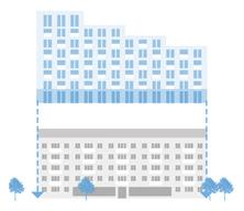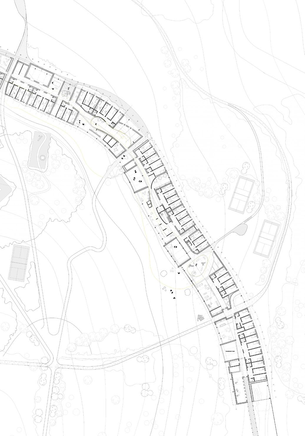 Taking advantage of the region’s great advantage - the relief - the project proposes to create terraced houses that follow the landscape. On the stepped roofs may be open terraces of apartments, public functions (for example, a vegetable garden) and solar panels can be placed.