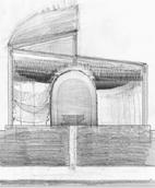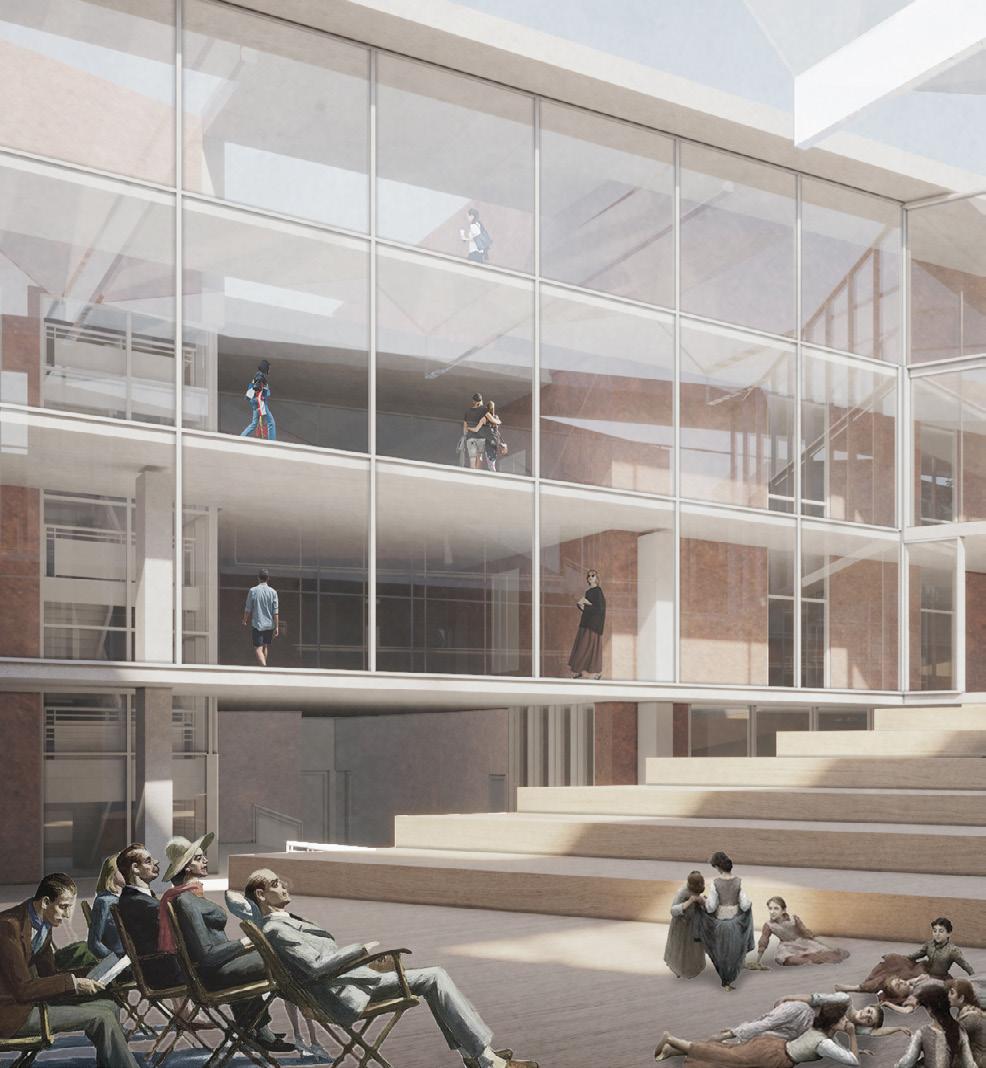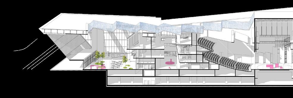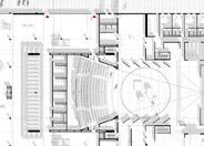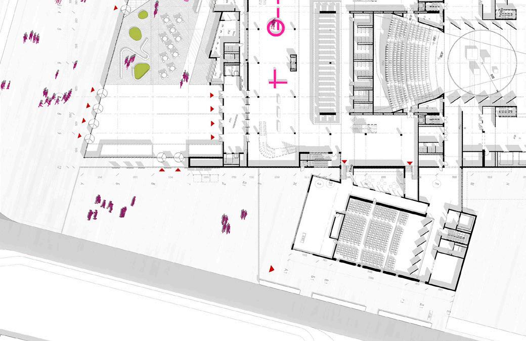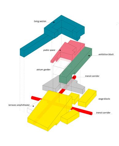 The center is divided into two functional areas - a presentation block with two auditoriums and a studio block with separate houses-workshops, an open amphitheater, cafes and apartments.