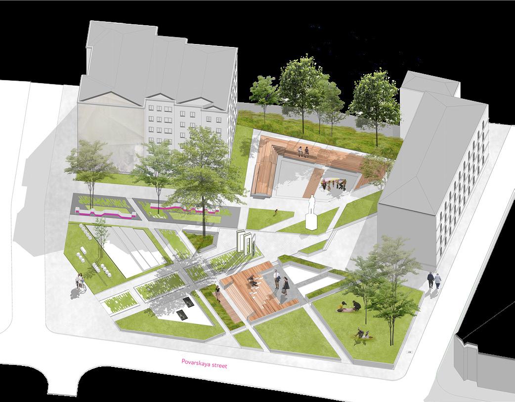 The project is based on the existing Bunin’s square in Moscow. The reorganization of public space contributes to the development of the district’s infrastructure, enriching it with a new recreational zone. The new square has a concept of a “third place” space - a place, between home and work.