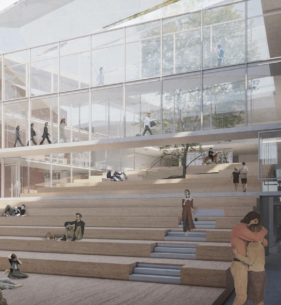 The solution was to create a cozy square that is perceived as a courtyard, and connects two amphitheaters. One is designed for office employees and students who often spend their free time in the square during breaks. The second one can become a presentation platform for students of theater universities.