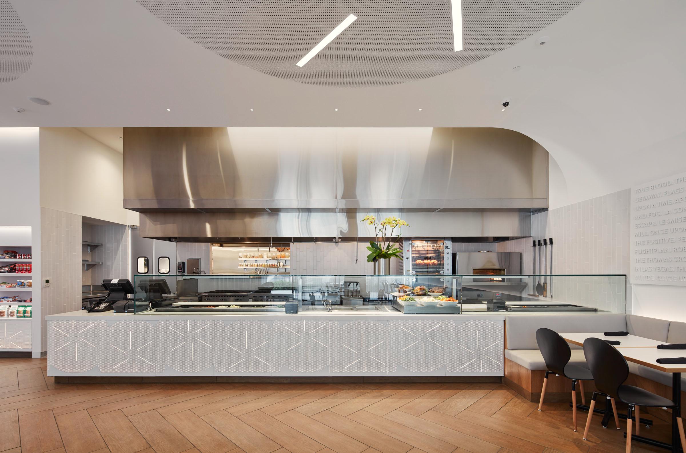 The design features oak wood flooring and wall panels in the dining area, which transition seamlessly to a white ceiling through a series of radial geometries. Initially, perforated gypsum was selected for its acoustic properties to achieve the desired sound quality in the space. However, we re-imagined the perforated gypsum circles—formed around the VRF units—as a graphic design element, creating a visual motif reminiscent of clouds in the sky. This concept was carried through into the aluminum panels in the kitchen and bar counter, creating a cohesive and dynamic design language.