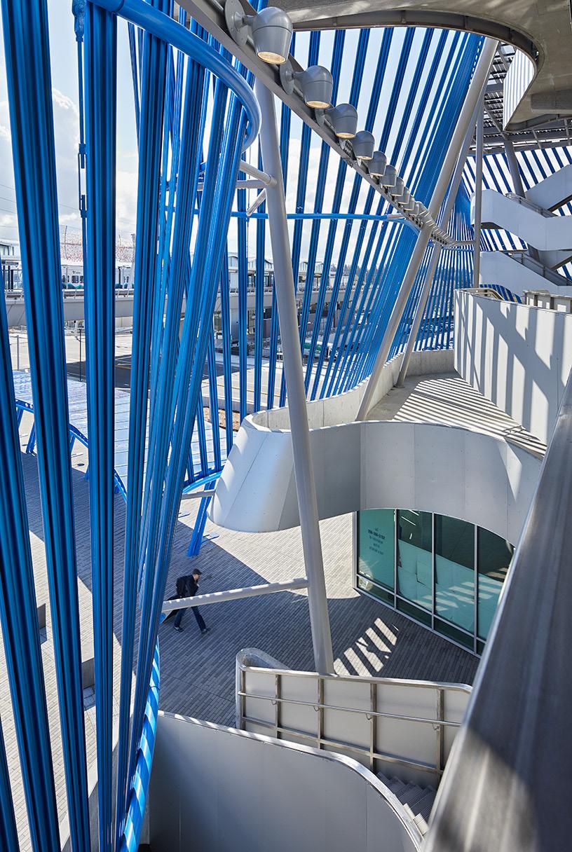 The hallmark of the new building is a 680-seat music performance hall with a vineyardstyle configuration to accommodate diverse live music. This spatial arrangement locates seats on all sides of the stage, providing closer connections between musicians and audience members. Acoustics, sight lines, and comfort were the key drivers in creating a warm and intimate space for all sizes of performances. A dedicated choir balcony is incorporated in the upper mezzanine level behind the stage. The defining feature of the all-wood clad hall is the dynamic wood liner that encompasses the upper walls and ceiling. This linear wood liner takes subtle inspiration from the staff lines found on sheet music; its pattern was closely designed with acoustical engineers to absorb and reflect sound for an optimized listening experience from every seat. morphosis.com
