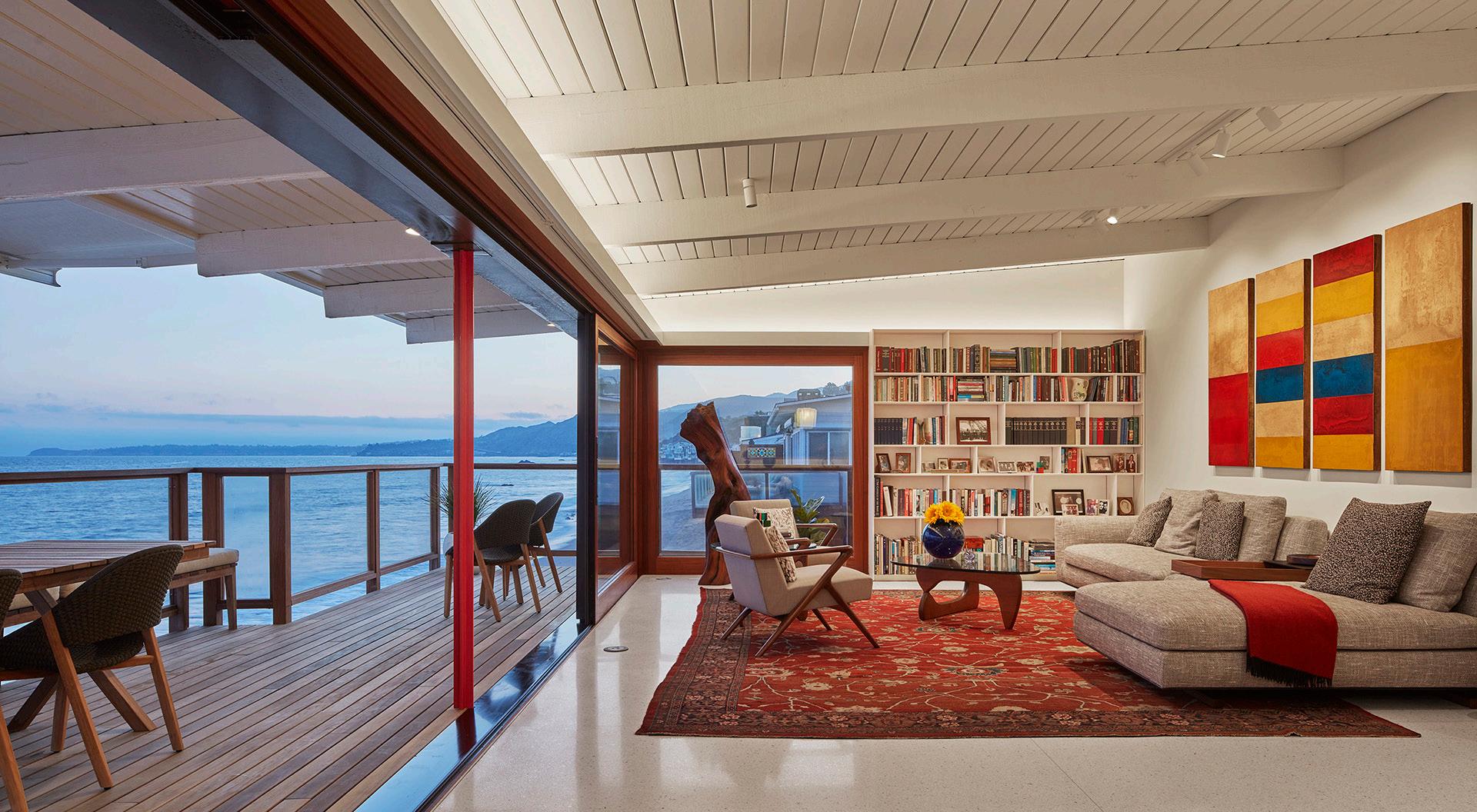 Project Overview: Situated on a sloped site in Malibu, this renovation reimagines a 2,250-square-foot split-level residence while preserving the original wood detailing that defines its character. The scope includes an interior remodel of the main living spaces—bedrooms, bathrooms, and the ocean-facing balcony—maintaining the existing layout while introducing a new planning concept and curated furnishings. Minor shell upgrades, including new windows and shading devices, enhance comfort and performance without compromising architectural integrity.