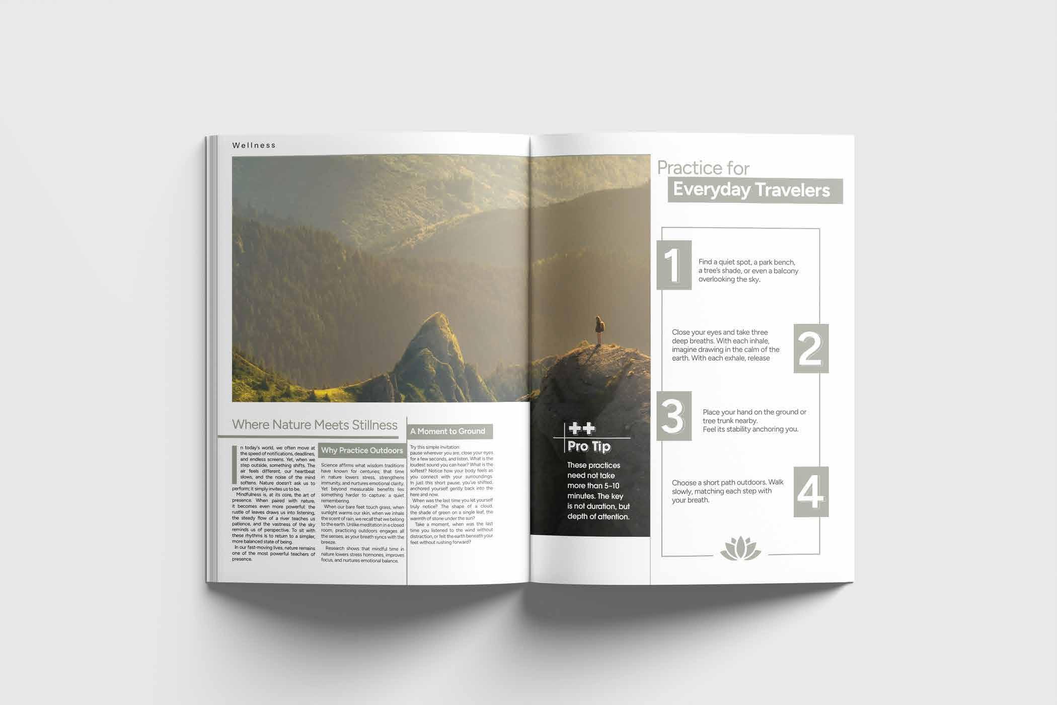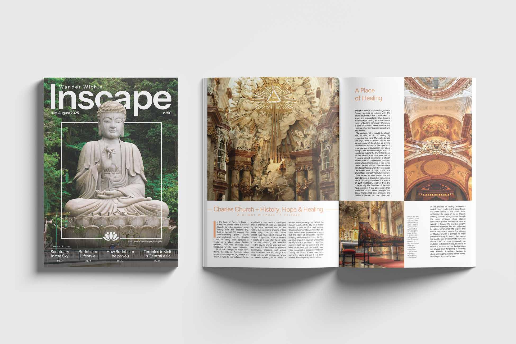Inscape is a premium, contemplative magazine that integrates wellness, travel, and spirituality into a single narrative journey, designed to be read as a slow, inward-moving experience. Reason I went with name Inscape is because it perfectly resonates with the theme as well as being a catchy name that is easy to remember-- it is an abbreviation of Internal Landscape. About