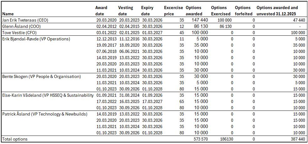 • The strike price of awarded options ranges from NOK 11 to NOK 82.