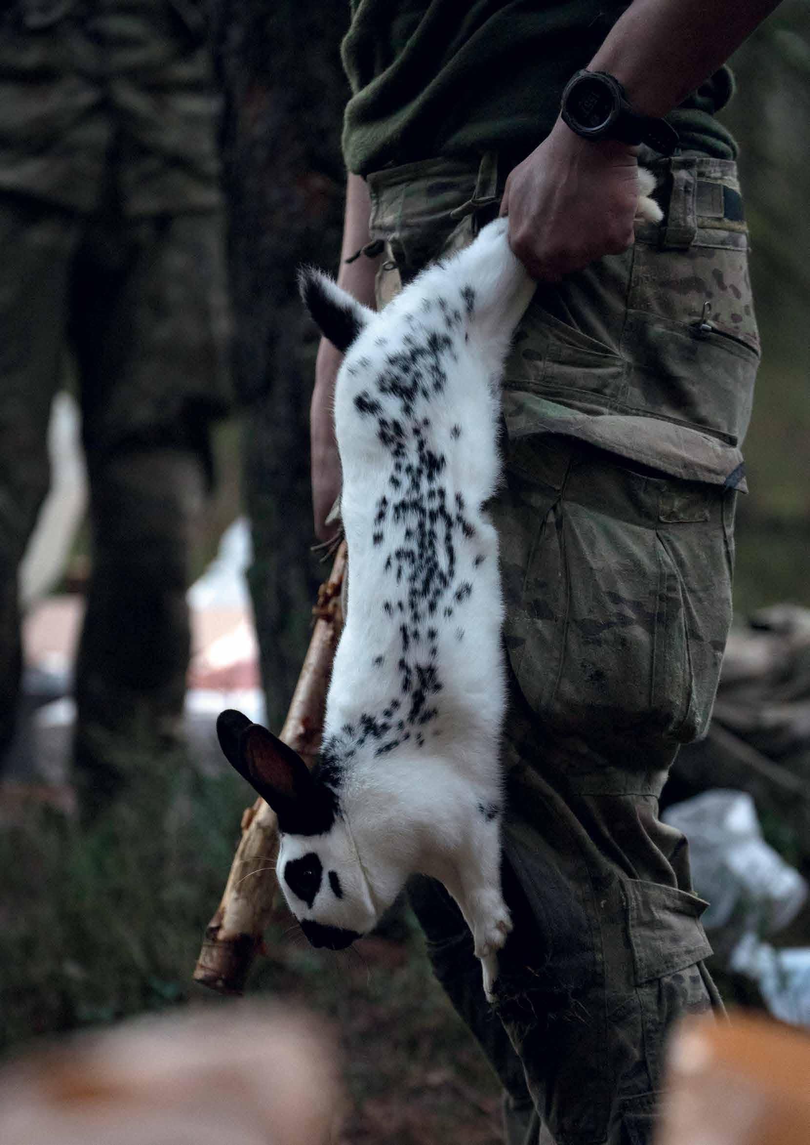 Eleverne, der skal dræbe kaninerne, tager hver deres papkasse med en kanin i. Der er ikke en eneste mine, der fortrækker sig i deres ansigter. De er dybt fokuserede på at klare opgaven. Kaninen er et konkret bevis på, at overlevelse i felten kræver mere end blot teoretisk viden og fysisk styrke.“Det er en fysisk og en psykologisk prøve. Kan du tage liv? Og kan du leve med det bagefter?”, siger 21-årige Loke, der ligeledes er konstabelelev ved Slesvigske Fodregiment.