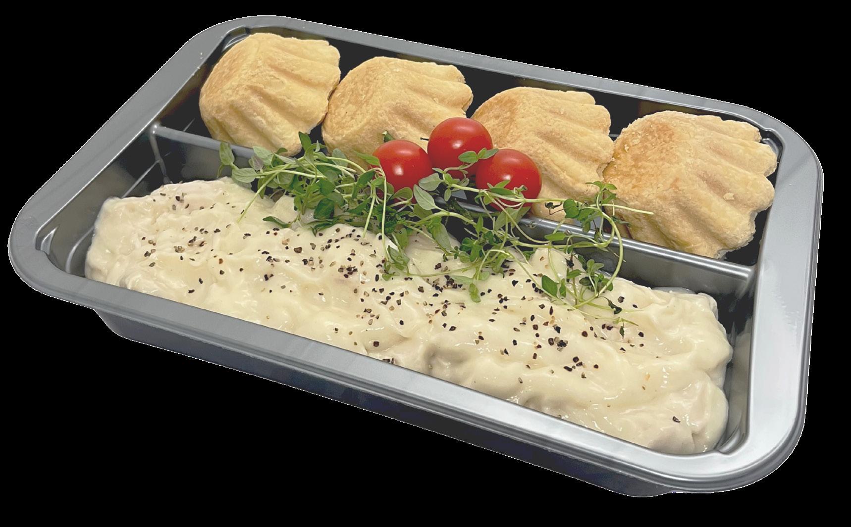 Sauce blandes koldt med kyllinge kød, behøves ikke opvarming før det er ved slutforbruger.