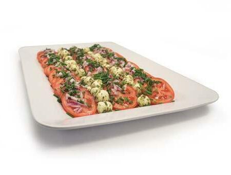 Fremstilling Tomaterne skæres skiver og lægges taglagt på fad. Mozzarella marineres i pestoen og lægges imellem rækker af tomatskiver (se foto). Pyntes af med fint hakket rød- samt purløg.