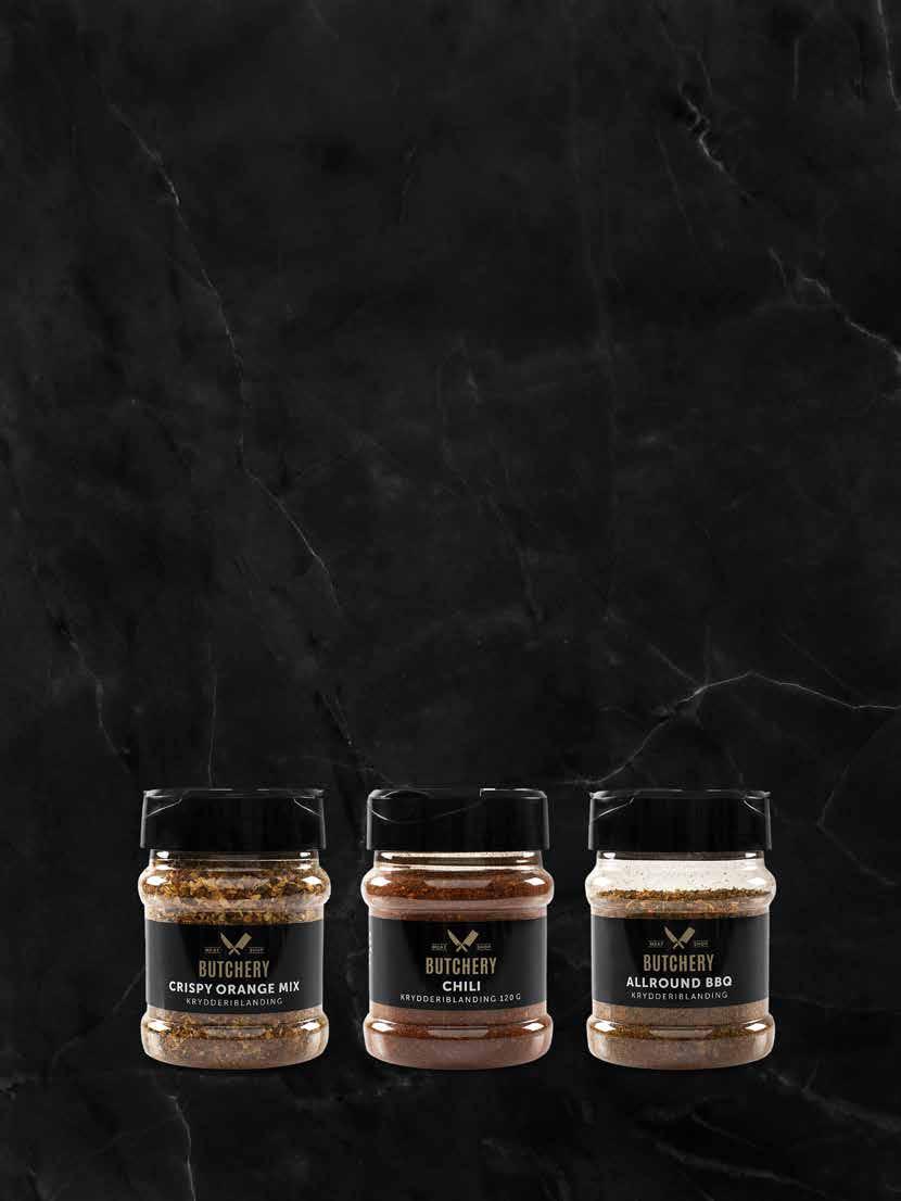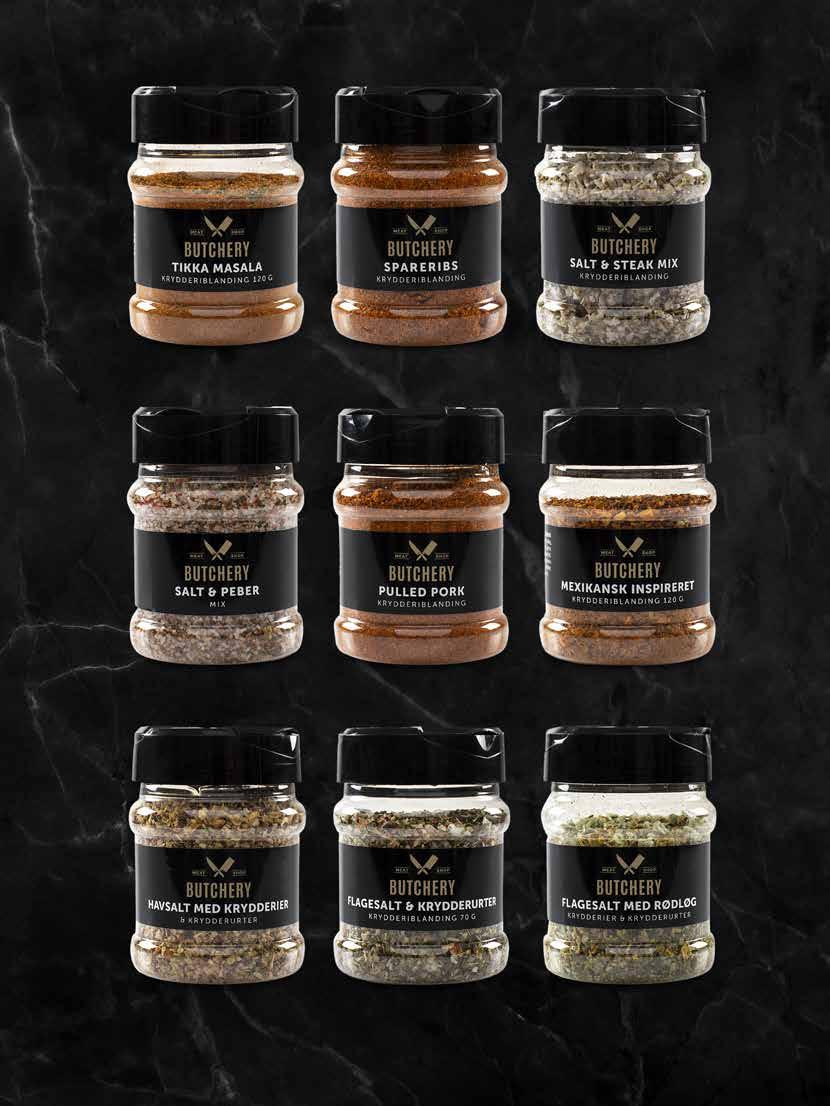 CRISPY ORANGEMIX Varenr 91 140 935 CHILI Varenr 91 140 944 NYHED ALLROUND BBQ Varenr . 91 140 942 TIKKA MASALA Varenr 91 140 946 NYHED SPARERIBS Varenr 91 140 937 SALT & STEAK MIX Varenr . 91 140 936 SALT & PEBER Varenr 91 140 938 PULLED PORK Varenr 91 140 939 MEXIKANSK INSPIRERET Varenr . 91 140 943 HAVSALT MED KRYDDERIER Varenr 91 140 941 FLAGESALT & KRYDDERURTER Varenr 91 140 945 FLAGESALT MED RØDLØG Varenr . 91 140 940 NYHED NYHED 40 | BUTCHERY KRYDDERIDÅSER