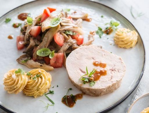 Roulade de dinde, sauce aux fines herbes, pleurotes, pommes de terre duchesse