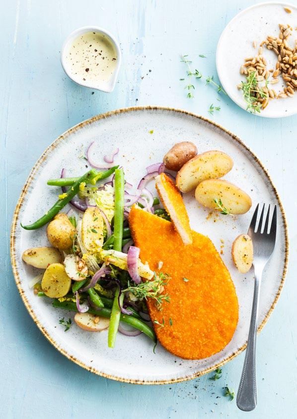 Escalope végétarienne, haricots verts, oignon, graines de tournesol, mini-salade, sauce à la moutarde, petites pommes de terre