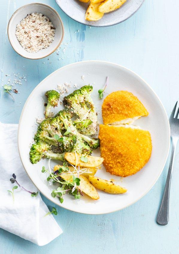 vegetarische kaasschnitzel met gebakken broccoli, hazelnoten, tuinkers en aardappel wings
