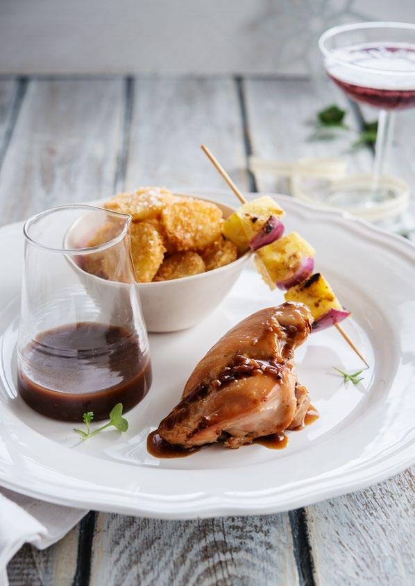 Gigotin de lapin sauce à la Kriek, brochette d’ananas et rondelles de pommes de terre