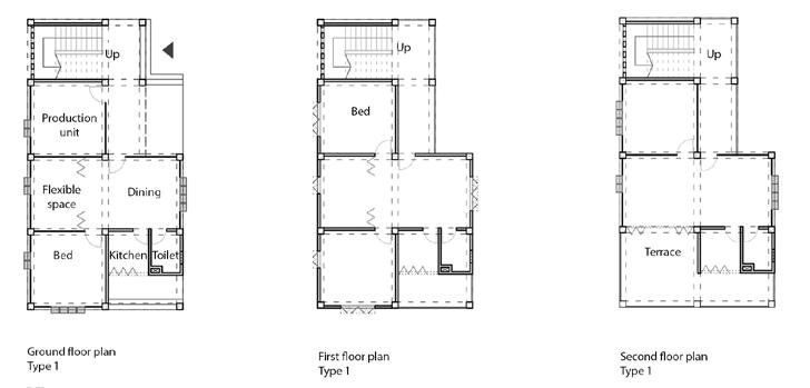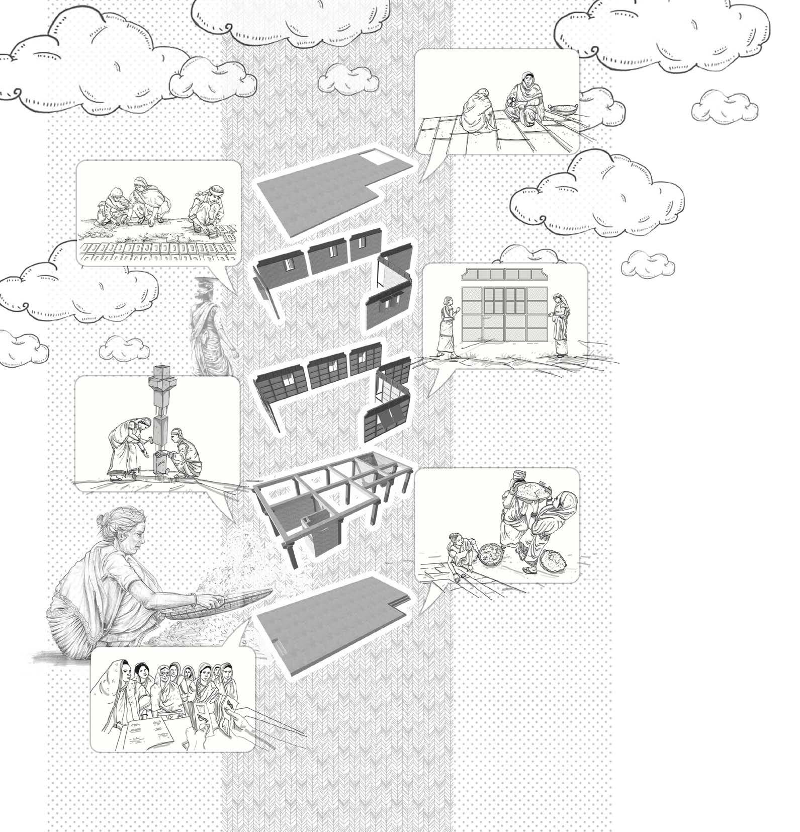 The Project shows how village women in Gazipur ( Dhaka) can build their own homes with the simple modular technique with small economic loan help. The project also shows the small home loan scheme for affordable housing. Since Gazipur is a drought area, the house has to be climatic and economically resilient. These houses have adaptable functional and flexible spaces with a mandatory production unit according to the user’s profession. Firstly with the small loan, they can build the base and make the prefab modular column for the main frame structure, later they can make a modular panel to infill the surroundings. Later homemade brick can replace those panels after repaying the first loan, they can build the second floor by themselves with those panels and the economic help from the ground-level production unit. No loan may not be needed this time, the infill materials may be used again in the second phase from the ground floor level. There are 3 types of housing units that are being shown and discussed in 3 phases of this project.