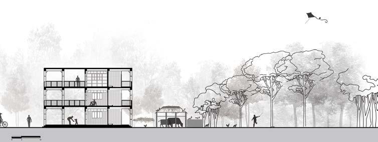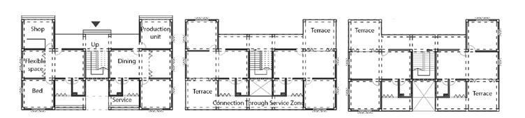 4. All the on-stage areas of different housing units may connect through some collective working area where people can meet others and work within privacy, semi-outdoor green space with some impermanent structure will be the perfect ambiance between work and relaxation.
