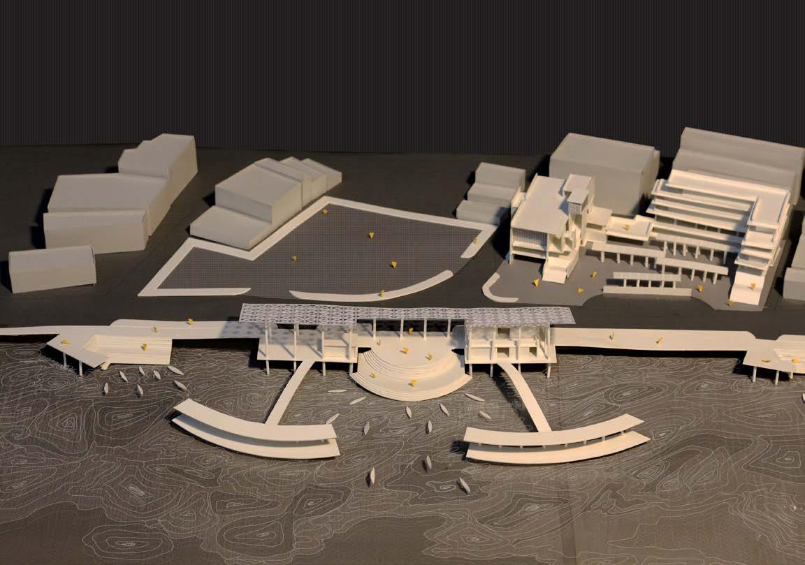 Sectional Perspective: Swarighat Mosque, Wholesale fish market, Business hub,godhi ghar building, the main road, bus stand, and the terminal and ponton on the riverfront. there is a long riverfront development for public gatherings, fairs, and public programs.