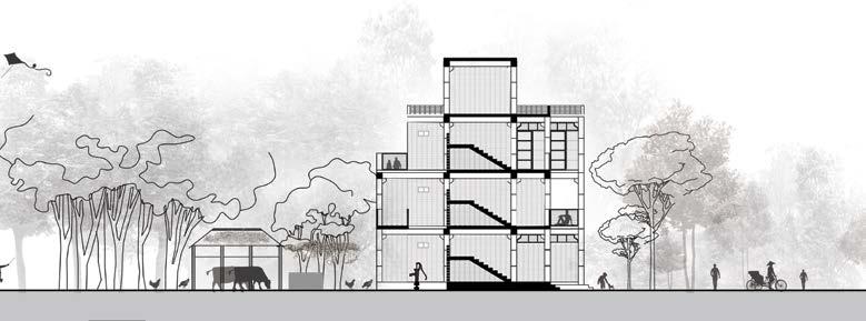 (Ground floor+First floor is open for public gatherings, food court, meeting the local community,cultural programs, and enjoying the lake view and skyline of Dhaka) The visual and physical connection between floors(2nd -14th) by stairs minimizes perceived crowding, enhances the recreational zone, and builds a sense of homogenous community and belongingness. The courtyard works as a connection factor to all the floors and units & makes a sense of collectiveness.