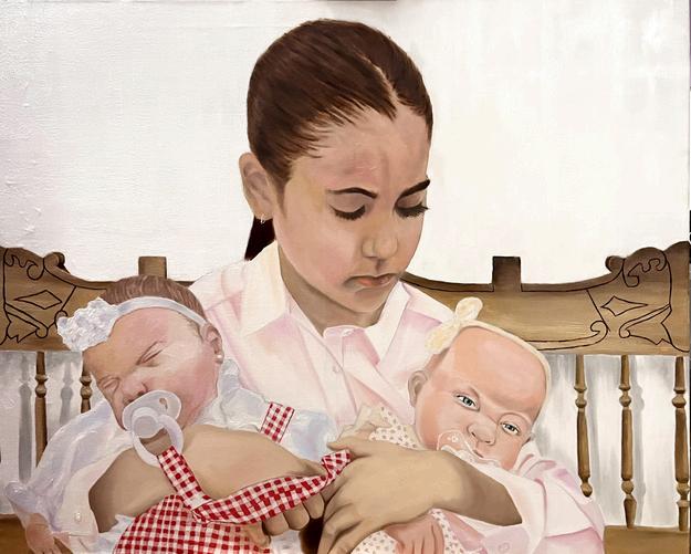 Esta obra reflexiona sobre la construcción de la identidad en la infancia, donde el juego y la imitación actúan commo herramientas de aprendizaje A través de la relación entre la figura y las muñecas, se evidencia cómo los roles, gestos y vínculos comienzan a interiorizarse desde edades tempranas.