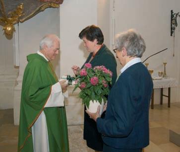 Die Pfarrgemeinde nutzte den letzten Gottesdienst, den Alois Glasner als Pfarrer von Mürzzuschlag in der Stadtpfarrkirche feierte, um sich bei ihm für seine elfjährige Tätigkeit im Pfarrverband zu bedanken. Die PfarrgemeinderatsVorsitzende Andrea Harich hob in ihrer kurzen Dankesrede die vielen Verdienste um die Pfarre hervor. Neben seiner gewissenhaften Vorbereitung der Gottesdienste mit aktuellen Bezügen in den Predigten erwähnte sie das neue Kirchendach, die Orgel