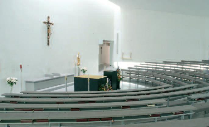 Beim Betreten dieses sehr schlicht gehaltenen Kirchenraums fällt eine Besonderheit auf: Es befindet sich kein Altar im Zentrum des Altarraumes, sondern es stehen rechts und links von der Mitte ein Altar des Brotes und ein Altar des Wortes Sofort entwickelte sich unter den Studierenden eine angeregte Diskussion über die theologische Bedeutung der ungewohnten architektonischen Gestaltung.
