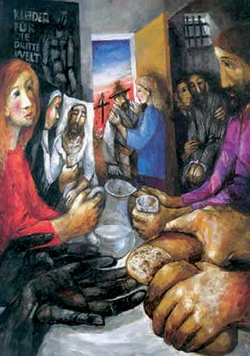 der Besuch im Gefängnis wird zur stärkenden, vertrauensvollen Umarmung; das Plakat mit der Bitte um Kleider lässt über unseren Überfluss nachdenken; eine blau gewandete Frau gewährt Einlass und auf dem Grab draußen stehen Zeichen liebevoller Erinnerung.