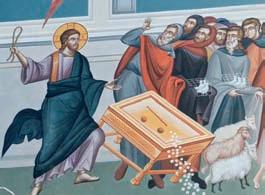 „Im Tempel fand er (Jesus) die Verkäufer von Rindern, Schafen und Tauben und die Geldwechsler, die dort saßen. Er machte eine Geißel aus Stricken und trieb sie alle aus dem Tempel hinaus, dazu die Schafe und Rinder; das Geld der Geldwechsler schüttete er aus und ihre Tische stieß er um.“ (Joh 2,14-15)