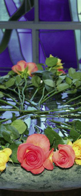 Erinnerung an ihren Verstorbenen, eine Rose zum Taufbecken zu bringen