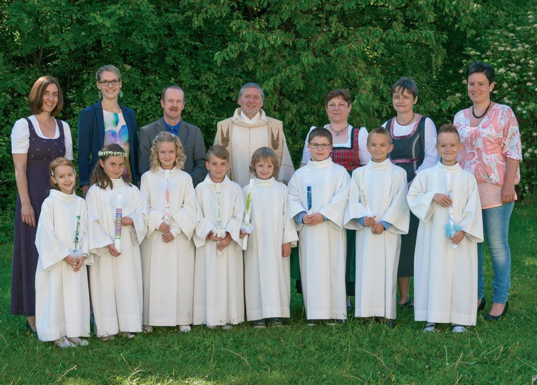 D a n i e l a G a u g l , D i r e k t o r K u r t R i e d l e r, P f a r r e r H a n s M o s b a c h e r, Religionslehrerin Juliana Eder, Pastoralassistentin Michaela Fetz, Kommunionbegleiterin Angelika Urschitz